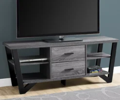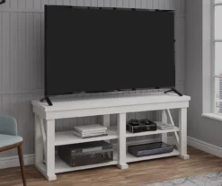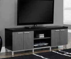 Reset your sanctuary in sleek, modern appeal with this three-door TV stand. Its modest yet contemporary frame and semi-open storage will beautifully debut your favorite collected pieces and curated décor. Two adjustable, tempered safety glass shelves on each side impart a convenient and classy touch of added storage to house media components, stemware, or novels. Three doors sans hardware lend a streamlined, minimalist look while their adjustable, soft-close metal hinges allow for easy access to ready-to-grab entertaining essentials for your next watch party or chic soiree.