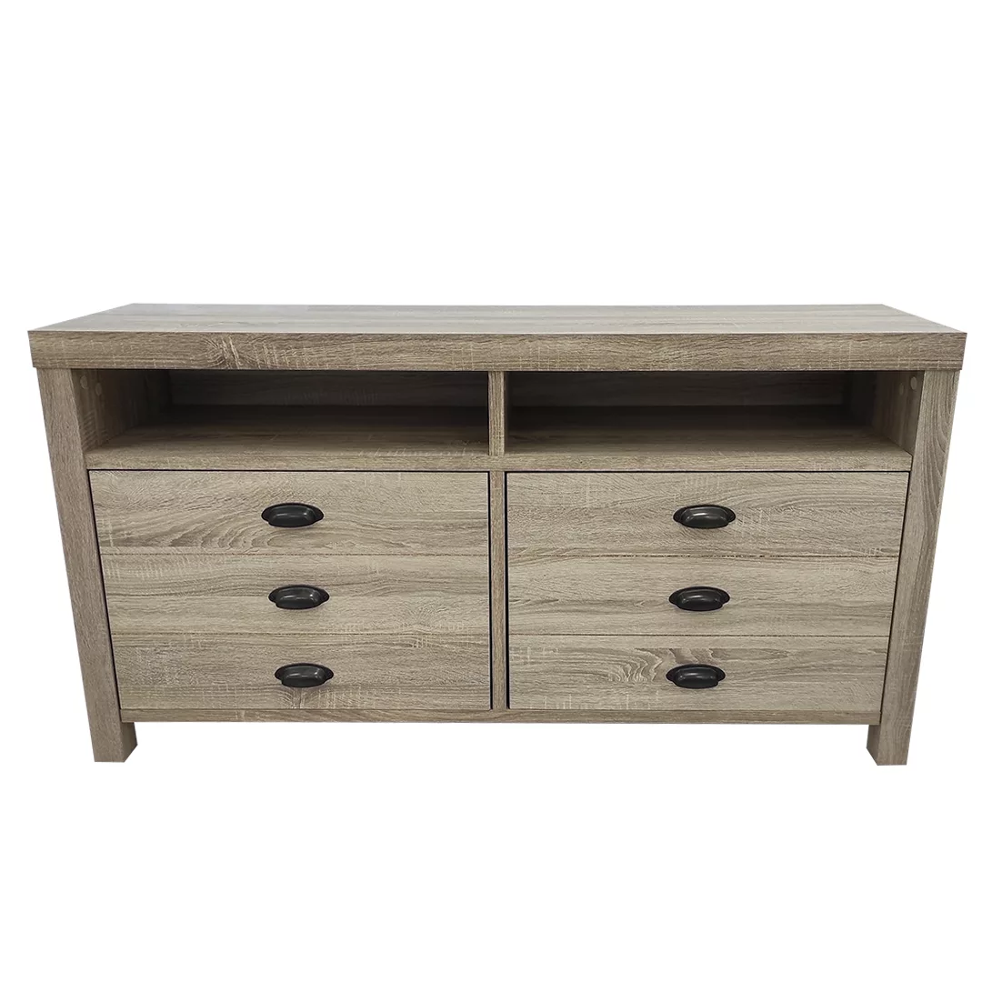 Bring style and organization to your living room with this multi-drawer TV stand from Real Living. Two doors with false drawer fronts and cup-style handles keeps items concealed behind hidden shelving as two spacious open cubbies offer space for media equipment. Finished in a weathered light brown, driftwood-inspired look, this TV stand brings form and function to your entertaining needs.