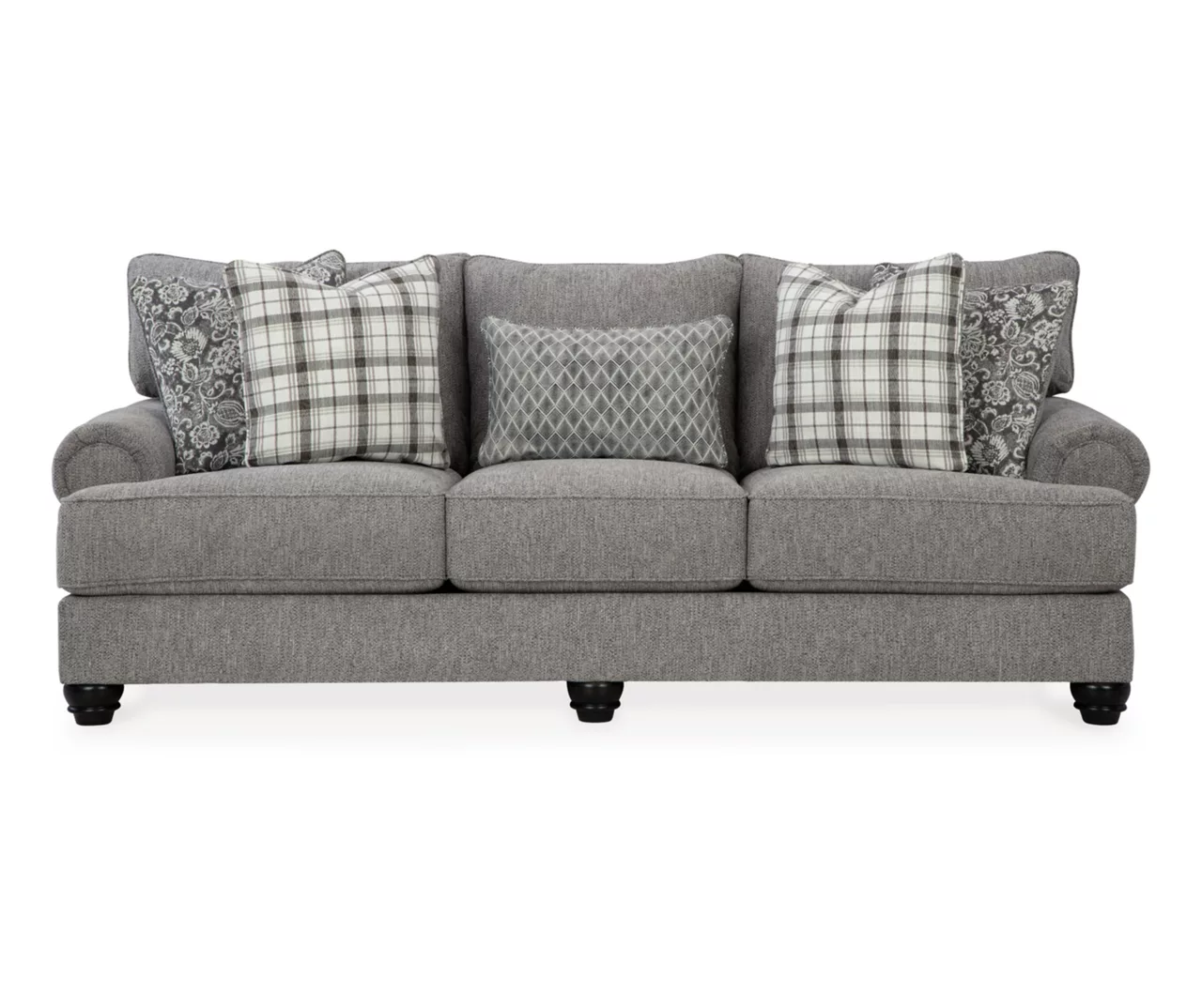 A triumph in transitional design, this sofa invites you to indulge in eye-catching texture and cozy comfort. Flared roll arms and loose, reversible cushions give this classically styled sofa a sense of everyday ease. Accent pillows add a wonderful layer of interest.